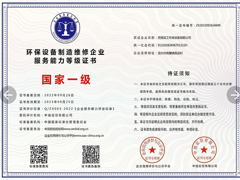 環保設備制造維修企業服務能力等級證書